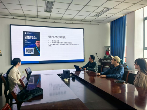 曹利老师首先就《计算机网络》课程建设的整体情况,从内容建设、实验配套、在线教学、思政探索四个维度进行了详细的成果介绍,并着重分享了实践案例呼应教学内容的教学体会。接着,曹利老师通过介绍在教学中设计以交换机为核心的系列实验,以及以路由器为核心相关实验,提出创建网络课程实践教学的工作情境的概念,让学生带着问题去做实验,强调“组网”与“协议”结合的思维。通过实验,指导学生自己发现网络问题,提出解决思路,最终通过实验验证,帮助学生反过来更好掌握计算机网络的理论内容。活动中,曹利老师和学院其他老师对思政内容如何巧妙融合课程内容,以及在线课程使用情况等问题进行了讨论。