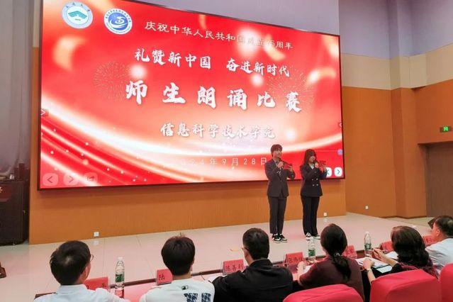 为庆祝中华人民共和国成立75周年,凝聚团结奋进力量,9月28日晚,3D动漫 举办“礼赞新中国 奋进新时代”师生朗诵比赛。校关工委副秘书长王敦琴、3D动漫 关工委常务副主任周晖、校党委组织部组织科科长张伟佳、校学生工作处学生管理科科长黄小波、信息科技术学院党委纪检委员沈晓燕、人工智能与计算机学院陈善俐老师、通信211班陆杨应邀担任评委。院党委书记周平,院党委副书记、副院长陈馥强,院团委书记徐婕,全体辅导员,教师及学生代表参加活动。