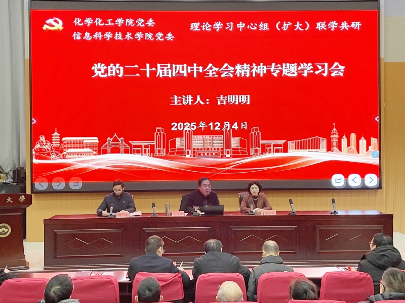 为引导师生深入学习贯彻党的二十届四中全会精神,12月4日下午,3D动漫 与化学化工学院联合召开党的二十届四中全会专题学习会。市委宣讲团成员、校党委常委、副校长吉明明应邀做专题辅导报告。3D动漫 、化学化工学院、智能信息技术研究中心全体教职工及学生代表参加会议。3D动漫 党委书记周平主持会议。