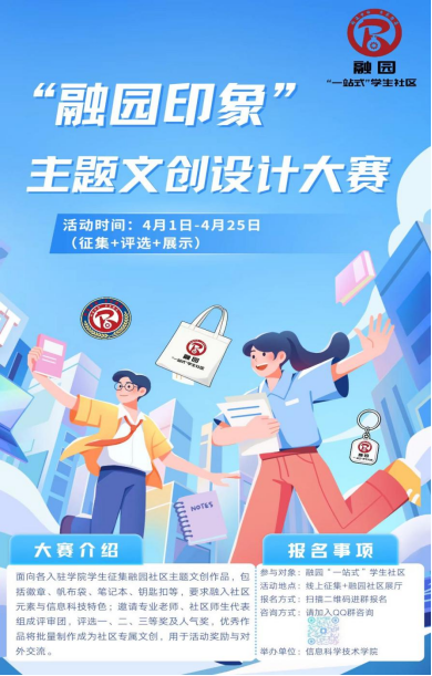 用设计诉说融园故事,用创意点亮校园生活。无论你是设计大神还是创意新手,都能在这场大赛中发光发热!快扫描海报二维码进群,提交你的作品,让融园记住你的创意吧!